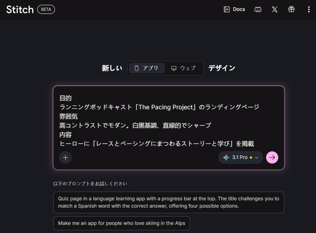 最初のステップは、Stitchトップページを開き、アプリの見た目(UI)を作成することから始まります。まずは「モバイルアプリ」か「PCウェブアプリ」を選択し、作りたいアプリのイメージをテキストで入力するだけです。