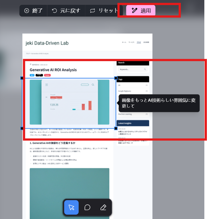 アノテーション(囲って修正依頼): 変更したい範囲を囲み、吹き出しで修正指示を出せます。指示はそのままChatに連携でき、上部の 適用 から反映できます。今回は「画像をもっとAI技術らしい雰囲気に変更して」と依頼し、画像差し替えに使いました。